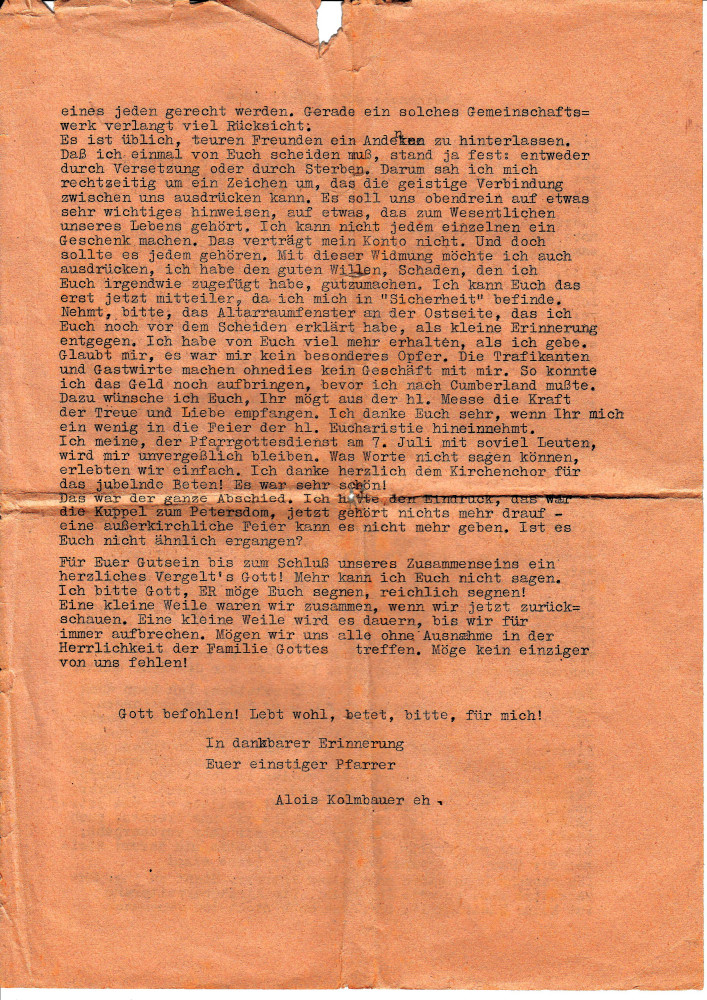 Die Pfarrbevölkerung gestaltete darum die Sonntagsmesse vorher ganz besonders festlich. Diese Form der Abschiedsfeier entsprach am besten seinem Wesen. Wir danken ihm für alles, was er unserer Pfarre elf Jahre lang gewesen ist: ein guter Hirte, unübertrefflich in Arbeitseifer und Hirtensorge, aber auch in persönlicher Härte und im Streben nach Vollkommenheit. Wir danken ihm für das priesterliche Geleit von der Wiege bis zum Grabe. Wir danken für die tägliche Opferfeier, das viele private Gebet, für das Opfern, Leiden, Sühnen und Büßen und für den Zuspruch. Wir danken für jedes gute Wort, das den Alten und Kranken, den Verzweifelten und Hilfesuchenden, den Notleidenden und Hartgetroffenen wieder Mut gemacht hat.