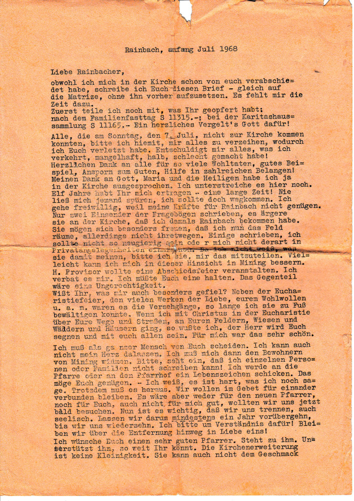 Für uns alle war er ein dauernde lebendiger Vorwurf, die dauernde Mahnung, dass es etwas gibt, was wichtiger ist als unsere noch so wichtige Berufsarbeit. Heute wissen wir es sicher: da lebte einer unter uns, der Gott so ernst genommen hat, dass er nur für Ihn und für uns da war. Für alle Mängel aber, unter denen er an uns gelitten hat, möchten wir ihn um Nachsicht bitten. Für die neue Pfarre wünschen wir ihm alle natürlichen und übernatürlichen Kräfte im Kampf gegen alle Resignation und Mutlosigkeit, gegen das Müdewerden auf dem steinigen Boden des Innviertels. Möge die neue Pfarre ihn vor Pessimismus verschonen. Sosehr wir seinen Weggang von Rainbach auch bedauern, so unverständlich uns auch seine Gründe dafür sind, wünschen wir doch, er möge Rainbach nur in guter Erinnerung behalten und vor allem in Mining keine undankbarere Gemeinde
