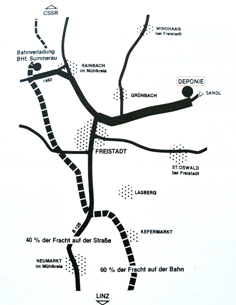 Zum faforisierten Standort wurde dann schließlich einer in der Gemeinde Grünbach, ziemlich angrenzend an das Gemeindegebiet St. Oswald (in der Nähe der Straße Freistadt-Sandl) gefunden, genannt „Holzmitte“. Trotzdem herrschte in unserer Gemeinde große Aufregung und Empörung wegen der Ankündigung der Landesregierung, dass 60 Prozent des Sondermülls für die Deponie „Holzmitte“ vom Bahnhof Summerau quer durch das Gemeindegebiet transportiert werden sollten. Ein erstes offizielles Informationsgespäch zwischen den Vertretern der Landesregierung und den Gemeindevertretern der betroffenen Gemeinden fand erst dann am 24. April in Linz statt.