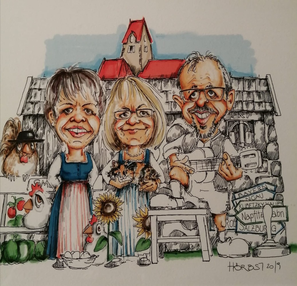 Eine besondere Freude bereiteten uns Bürgermeister Fritz Stockinger und Familie Dietmar und Bettina Greul, als sie uns im Mai 2019 ein Überraschungsgeschenk machten. In Absprache mit unseren Kindern wurde ein Fest organisiert, bei dem viele unserer Musikantenfreunde eingeladen waren. Als wir den Saal beim Maurerwirt betraten, stimmten alle Gäste eines unserer Lieder, das „Mailüfterl“ mit maßgeschneidertem Text für uns als Ständchen an. Wir waren vor Emotionen zu Tränen gerührt und brachten kein Wort über die Lippen. Für Speis und Trank sorgten die Wirtsleute und Bürgermeister Stockinger. Ebenso erhielten wir bei diesem Anlass das Ehrenzeichen der Marktgemeinde Rainbach i. M. feierlich überreicht. Eine Karikatur des „Rainbacher Dreig’sang“, angefertigt von Rupert Hörbst hatten Bettina und Dietmar Greul für uns besorgt. Es wurde bis spät in die Nacht gesungen, musiziert, getanzt und gelacht. Ein schöneres Fest hätten wir uns nicht vorstellen können! Wir haben uns darüber sehr gefreut und sagen:„Danke schön!“ (Traudi, Hubert und Renate)