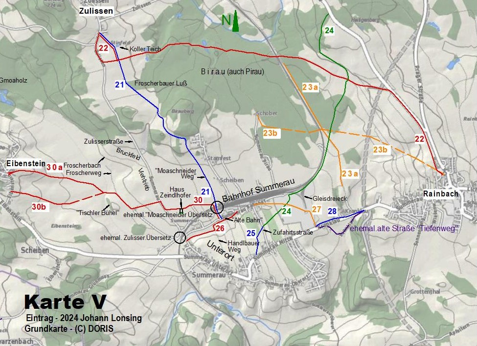 Anmerkung: Vom Ortsteil Kollern, in Zulissen ganz unten, nahe der Grenze zu Tschechien, gingen die Bewohner zur Kirche und zum Einkaufen eher ins näher liegende Reichenthal. Mussten sie aber nach Summerau zum Zug, so ging man über das „Gmoaholz“, das „Bruckfeld“ und die „Viehtrieb“ zum Bahnhof (Verlauf nicht dargestellt).