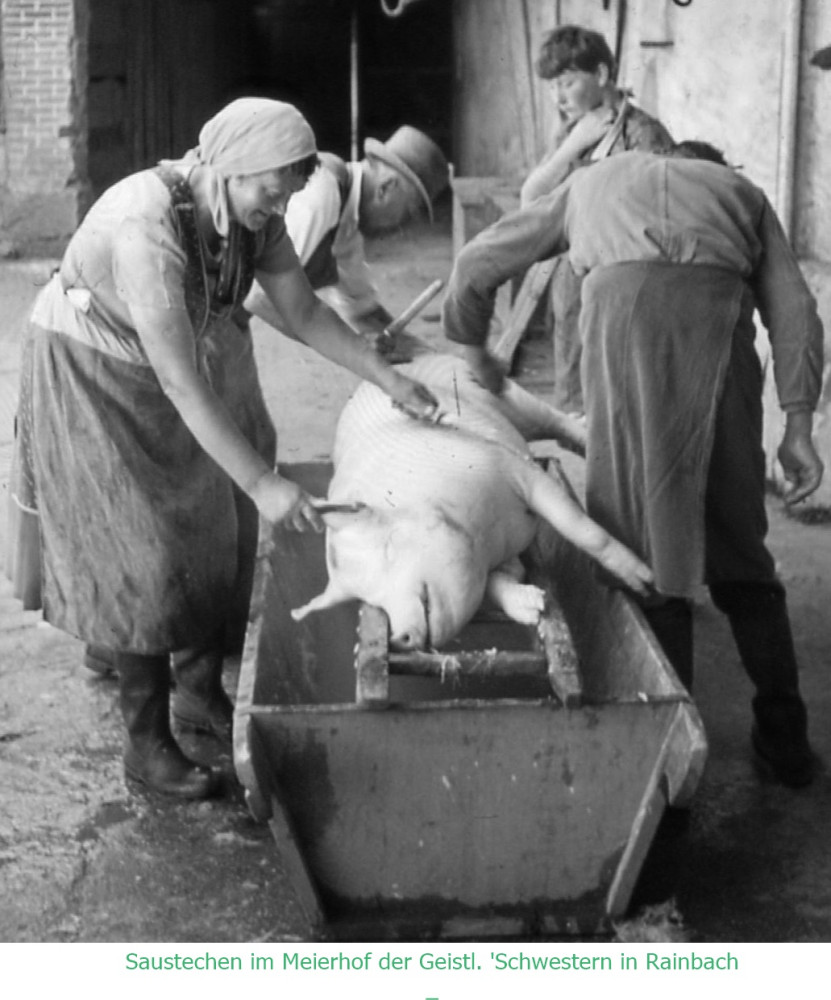 Einmal oder öfters im Jahr (vielfach am Thomastag, 21. Dezember), je nachdem wie groß die Familie war, wurde zur Selbstversorgung des bäuerlichen Haushaltes ein Schwein geschlachtet. Früher als sonst in der kalten Jahreszeit begann in Haus und Hof noch im Dunkeln einemsiges Treiben. Ein Kessel wurde angeheizt, um heißes Wasser für die "Saurasur" zu haben. Auch der Sautrog, in dem das Schwein gewaschen und von den Borsten befreit wurde, sowie der "Fleischstock", ein hölzerner Tisch, aus einem Stück zugehauen, auf dem die Sau dann zerlegt wurde, mussten bereitgestellt werden. Denn der "Saustecher" wurde bald erwartet. Dieser war im allgemeinen ein Fleischhacker oder jemand, der von der Sache etwas verstand. Nach einem aufwärmenden Stamperl machte man sich an die Arbeit. Was bei den Erwachsenen schon längst zur Routine geworden war, versetzte die Kinder in Spannung und leichtes Schaudern.