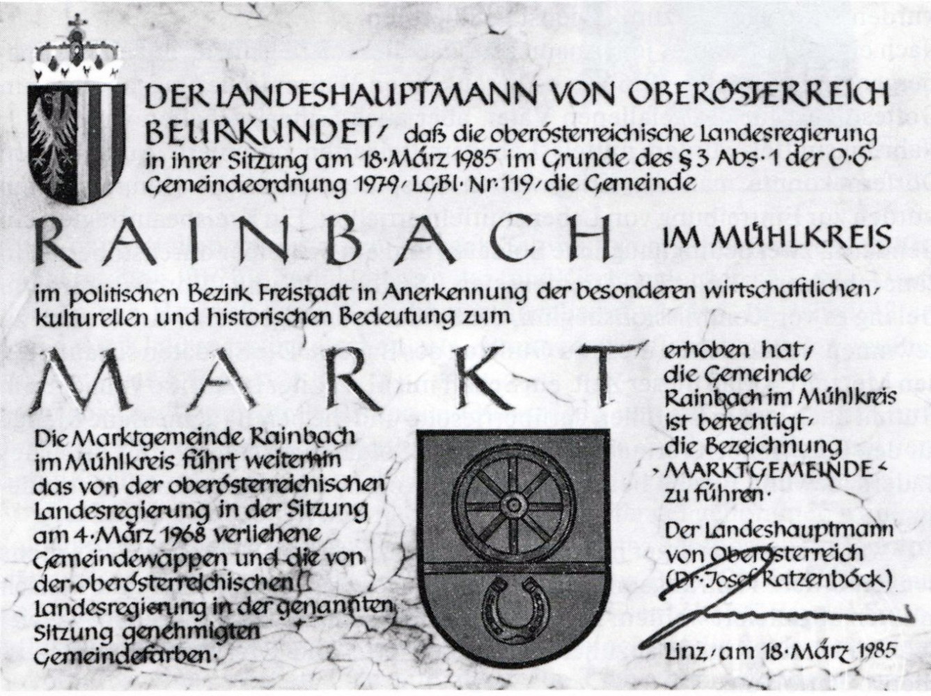 Weil der Gemeinderat der Ansicht war, dass diese positive Entwicklung der letzten Jahrzehnte in Rainbach durch die Verleihung des Titels „Markt“ gewürdigt werden sollte, beantragte er am 21.12.1984 bei der OÖ Landesregierung die Markterhebung, die diesem Wunsche mit einem Beschluss vom 18. März 1985 nach kam. Voll Stolz feierte man dann am 22. Juni 1986 mit einer Feier und einem umfangreichen Kulturprogramm die Titelverleihung.