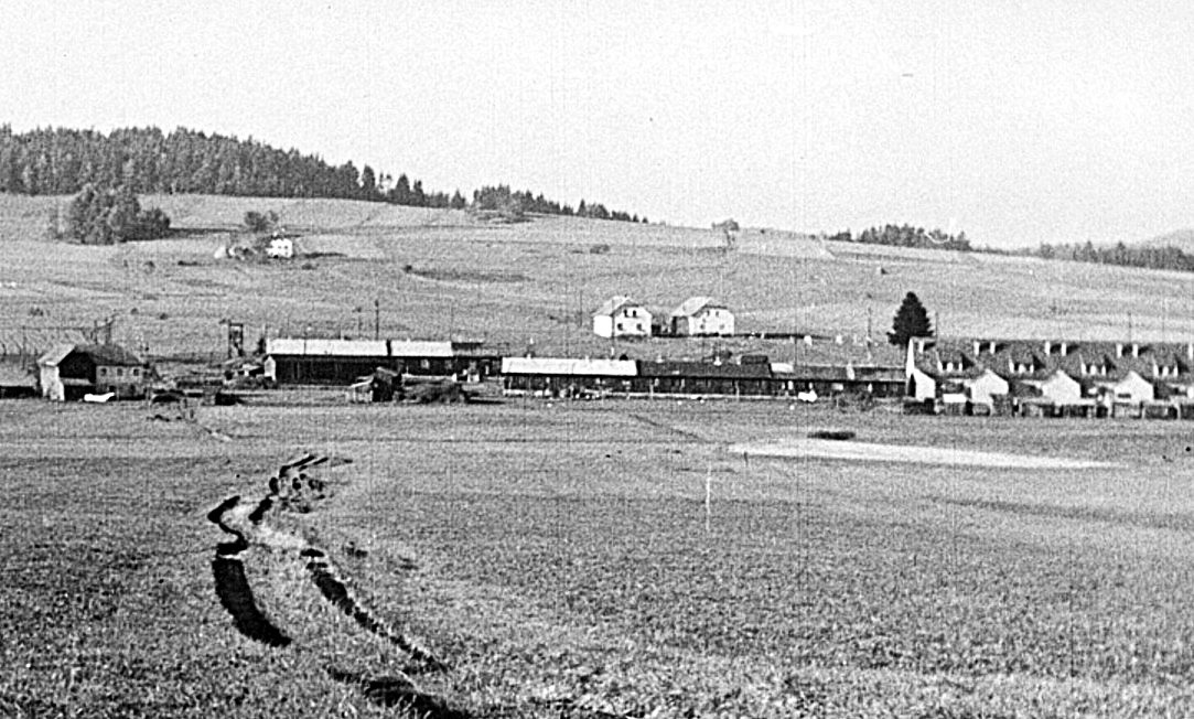 Im älteren Bild, aus dem Jahr 1963, ganz links das 1920 errichtete Wohnhaus Reisinger - 1925 von der Familie Wenzel Knogler erworben. Der vom Dorf zum Bahnhof hinunter verlaufende Feldweg geht rechts an besagtem Wohnhaus vorbei, überquert auf der 1975 aufgelassenen „Moaschneider Übersetz“ den Schienenstrang der Eisenbahn und läuft weiter auf die Wirtschaftsgründe „Mitterfeld“ und „Pirau“. Rechts von diesem Weg noch einer der beiden 1946 auf beiden Bahnhofsenden aufgestellten Zoll-Kontrolltürme. Weiter rechts die 1918 errichteten Wohnbaracke eins mit dem im Osten plazierten KONSUM-Geschäft und die Baracke zwei mit der Zugsbegleiterunterkunft. Ganz rechts nach den Baracken ist das 1951 errichtete, damals moderne Reihenwohnhaus ersichtlich. An diesem Platz standen vorher die Wohnbaracken drei und vier. Hinter den Barackenbauten, nördlich vom Bahnhof, die beiden 1950-55 errichteten Wohnhäuser Ernst u. Aloisia Knogler (später Leitner) und Alois u. Maria Knogler. Folgt man dem dort vorbeiführenden Weg weiter den Pirauberg hinauf, so sieht man auf diesem Bild noch das ehemalige, zirka 1840 erbaute, Kleinbauernhaus „Stamfest“. Dieses, damals einzige Haus am Pirauberg, wurde in den 1980er Jahren für einen Neubau abgetragen.