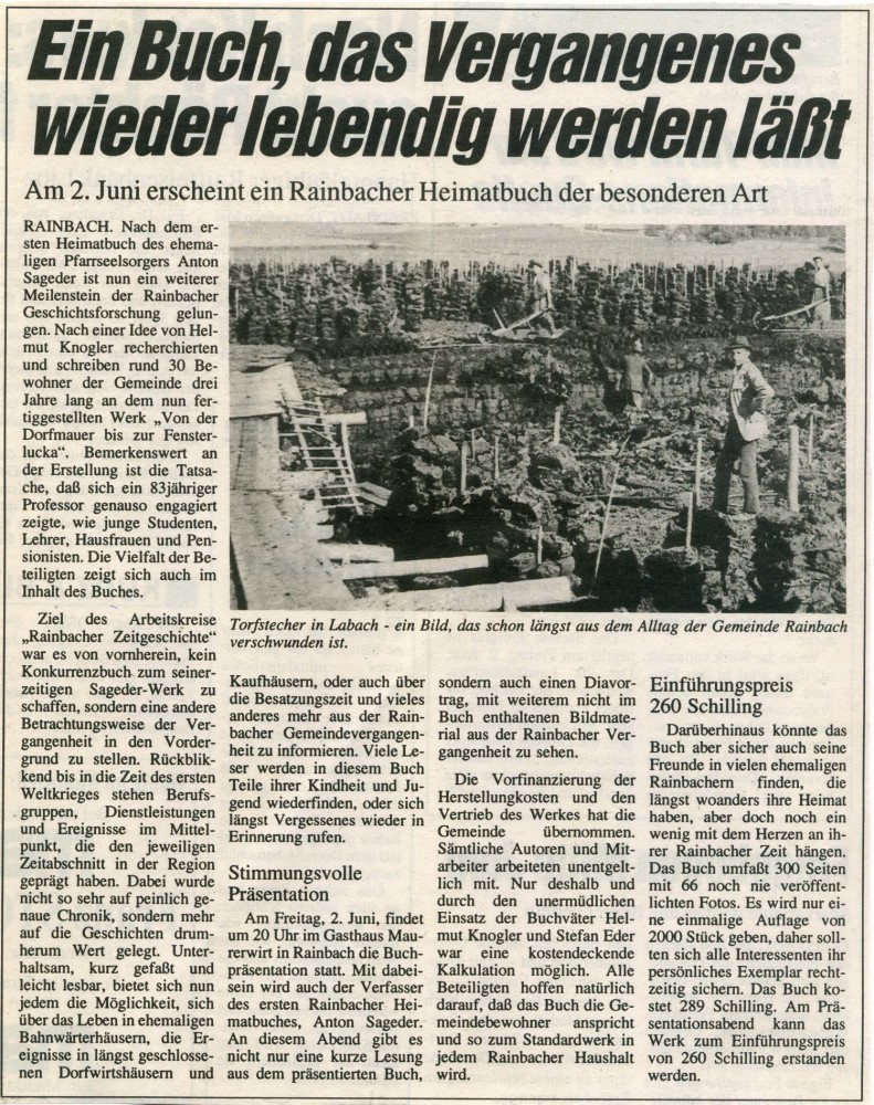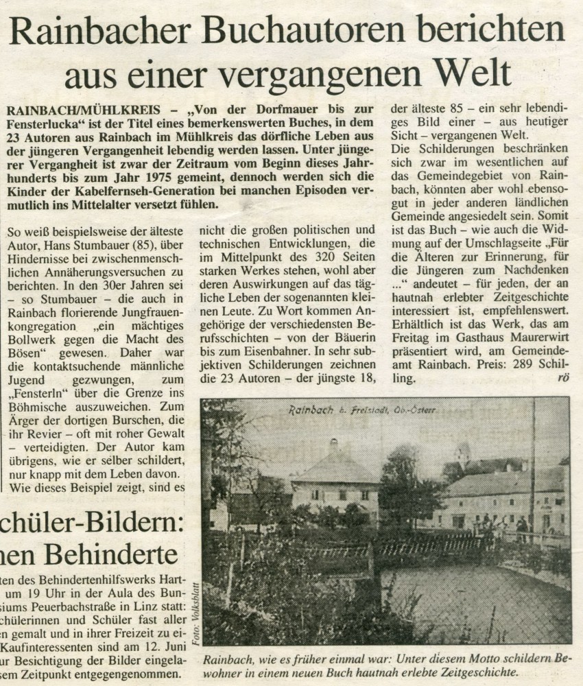 RAINBACH. Zu einem gelungenen Abend wurde die Buchpräsentation des neunen Heimatbuches "Von der Dorfmauer bis zur Fensterlucka". Rund 180 Besucher fanden sich ein, um die Entwicklung des Buches von der Idee bis zur Umsetzung zu erfahren. Der ehemalige Rainbacher Pfarrer Anton Sageder bezeichnete in seiner Rede den Inhalt des Buches als wichtige Zeitgeschichte, deren Dokumentation in der schnelllebigen Zeit von heute besonders wertvoll ist.