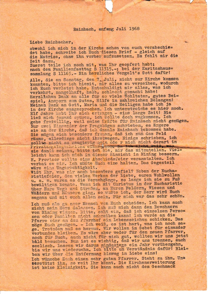 für uns da war. Für alle Mängel aber, unter denen er an uns gelitten hat, möchten wir ihn um Nachsicht bitten. Für die neue Pfarre wünschen wir ihm alle natürlichen und übernatürlichen Kräfte im Kampf gegen alle Resignation und Mutlosigkeit, gegen das Müdewerden auf dem steinigen Boden des Innviertels. Möge die neue Pfarre ihn vor Pessimismus verschonen. Sosehr wir seinen Weggang von Rainbach auch bedauern, so unverständlich uns auch seine Gründe dafür sind, wünschen wir doch, er möge Rainbach nur in guter Erinnerung behalten und vor allem in Mining keine undankbarere Gemeinde