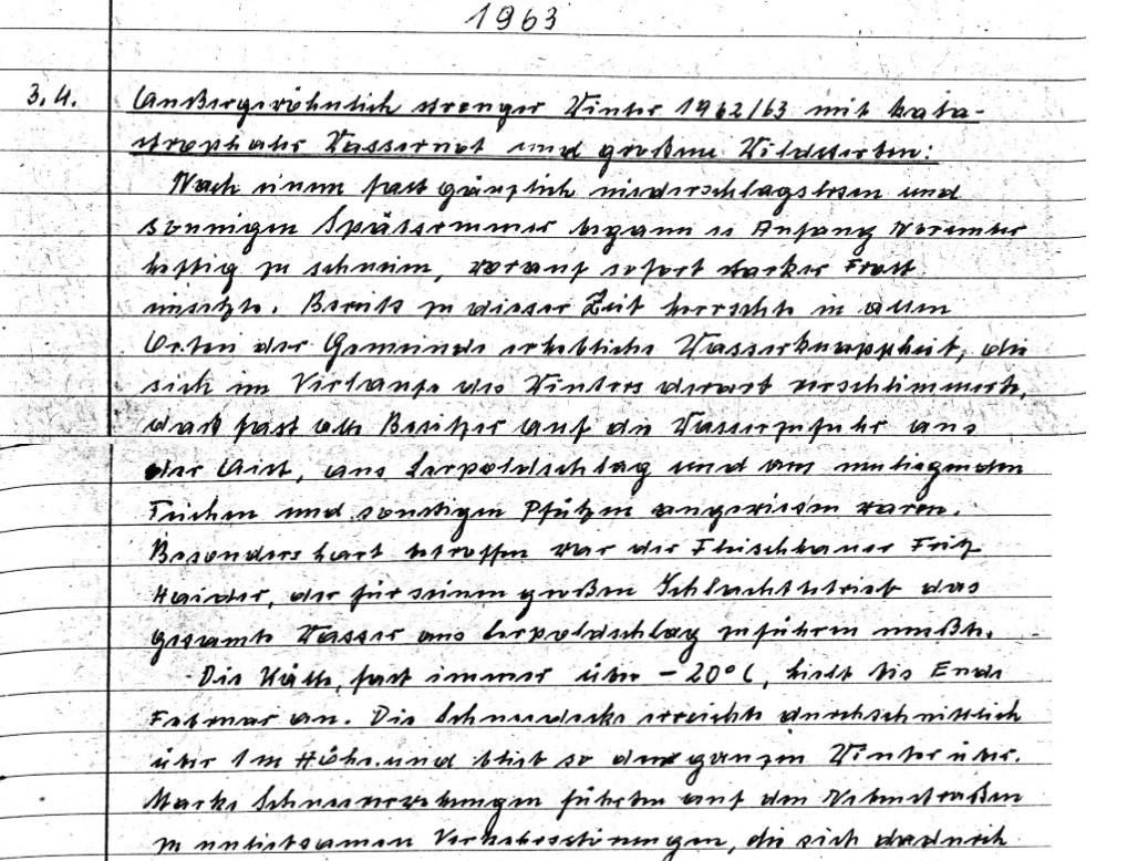 Die Kälte, fast immer unter minus 20 Grad, hielt bis Ende Februar an. Die Schneedecke erreichte durchschnittlich über 1 Meter Höhe und blieb so ganzen Winter über. Starke Schneeverwehungen führten auf den Nebenstraßen zu unliebsamen Verkehrsbehinderungen, die sich dadurch ergaben, weil auf diesen Straßen infolge der hohen Schneewächten der Verkehr nur in einer Richtung möglich war. Der gemeindeeigene Schneepflug stand mit einem Lkw der Firma Waldhauser fast ununterbrochen und oft bis in die späte Nacht hinein im Einsatz, was der Gemeindekasse große Auslagen verursachte.