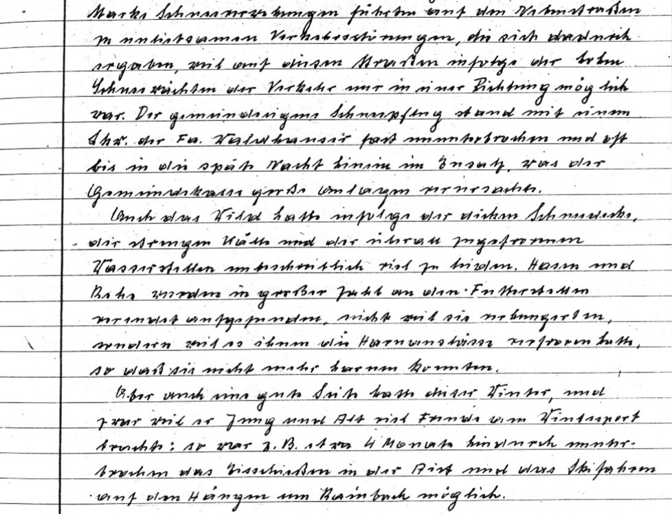 Auch das Wild hatte infolge der dicken Schneedecke, der strengen Kälte und der überall zugefrorenen Wasserstellen unbeschreiblich viel zu leiden. Hasen und Rehe wurden in großer Zahl an den Futterstellen verendet aufgefunden, nicht weil sie verhungerten, sondern weil es ihnen die Harnauslässe verfroren hatte, so dass sie nicht mehr harnen konnten.