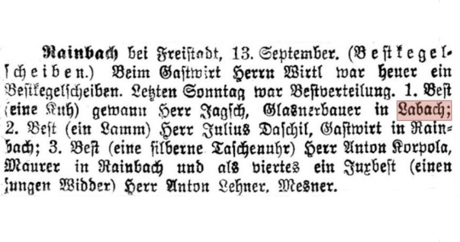 Rainbach bei Freistadt, 13. September. (Bestkegelscheiben.) Beim Gastwirt Herrn Wirtl war heuer ein Bestkegelscheiben. Letzten Sonntag war Bestverteilung. 1. Best (eine Kuh) gewann Herr Jagsch, Glasnerbauer in Labach; 2. Best (ein Lamm) Herr Julius Daschil, Gastwirt in Rainbach; 3. Best (eine silberne Taschenuhr) Herr Anton Korpola, Maurer in Rainbach und als viertes ein Juxbest (einen jungen Widder) Herr Anton Lehner, Mesner.