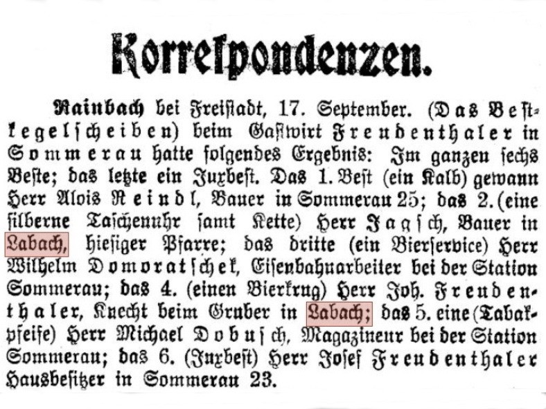 silberne Taschenuhr samt Kette) Herr Jagsch, Bauer in hiesiger Pfarre; das dritte (ein Bierservice) Herr Wilhelm Domoratschek, Eisenbahnarbeiter bei der Station Sommerau; das 4. (einen Bierkrug) Herr Joh. Freudenthaler, Knecht beim Gruber in Labach; das 5. eine (Tabakpfeife) Herr Michael Dobusch, Magazineur bei der Station Sommerau; das 6. (Juxbest) Herr Josef Freudenthaler Hausbesizer in Sommerau 23.