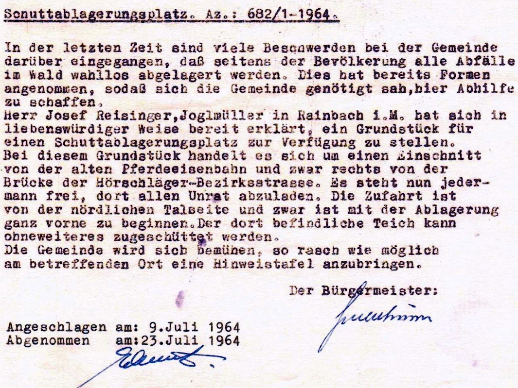 Herr Josef Reisinger, Joglmüller in Rainbach i.M. hat sich in liebenswürdiger Weise bereit erklärt, ein Grundstück für einen Schuttablagerungsplatz zur Verfügung zu stellen. Bei diesem Grundstück handelt es sich um einen Einschnitt von der alten Pferdeeisenbahn und zwar rechts von der Brücke der Hörschläger-Bezirksstrasse. Es steht nun jedermann frei, dort allen Unrat abzuladen. Die Zufahrt ist von der nördlichen Talseite und zwar ist mit der Ablagerung ganz vorne zu beginnen. Der dort befindliche Teich kann ohne weiteres zugeschüttet werden.