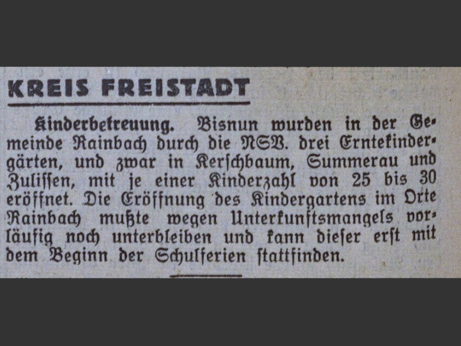Kinderbetreuung. Bisnun wurden in der Gemeinde Rainbach durch die RSB. drei Erntekindergärten, und zwar in Kerschbaum, Summerau und Zulissen mit je einer Kinderzahl von 25 bis 30 eröffnet. Die Eröffnung des Kindergartens im Orte Rainbach mußte wegen Unterkunftsmangels vorläufig noch unterbleiben und kann dieser erst mit Beginn der Schulferien stattfinden.