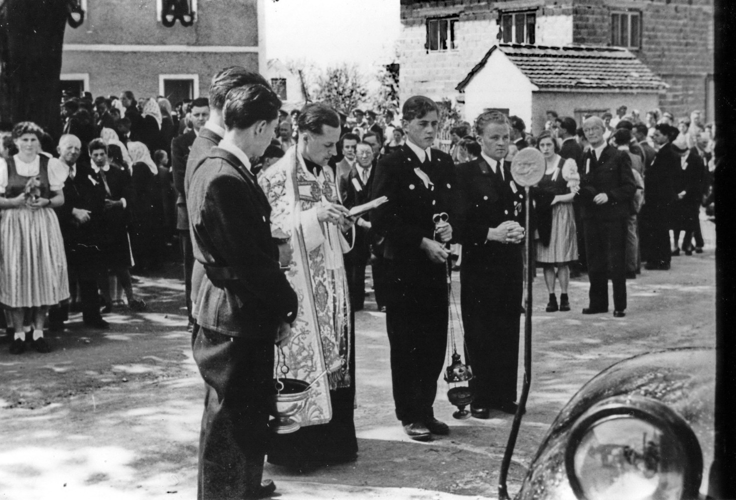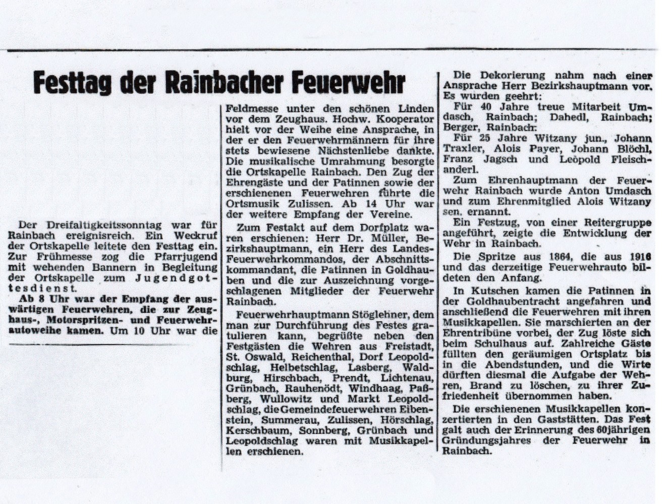 Der Dreifaltigkeitssonntag war für Rainbach ereignisreich. Ein Weckruf der Ortskapelle leitete den Festtag ein. Zur Frühmesse zog die Pfarrjugend mit wehenden Bannern in Begleitung der Ortskapelle zum Jugendgottesdienst. Ab 8 Uhr war der Empfang der auswärtigen Feuerwehren, die zur Zeughaus-, Motorspritzen- und Feuerwehrautoweihe kamen. Um 10 Uhr war die Feldmesse unter den schönen Linden vor dem Zeughaus. Hochw. Kooperator hielt vor der Weihe eine Ansprache, in der er den Feuerwehrmännern für ihre stets bewiesene Nächstenliebe dankte. Die musikalische Umrahmung besorgte die Ortskapelle Rainbach. Den Zug der Ehrengäste und der Patinnen sowie der erschienenen Feuerwehren führte die Ortsmusik Zulissen. Ab 14 Uhr war der weitere Empfang der Vereine.