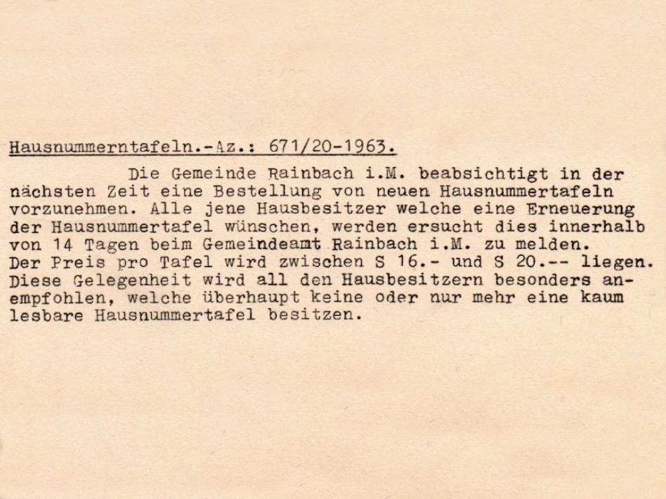 Die Gemeinde Rainbach i.M. beabsichtigt in der nächsten Zeit eine Bestellung von neuen Hausnummertafeln vorzunehmen. Alle jene Hausbesitzer, welche eine Erneuerung der Hausnummertafel wünschen, werden ersucht, dies innerhalb von 14 Tagen beim Gemeindeamt Rainbach i.M. zu melden.