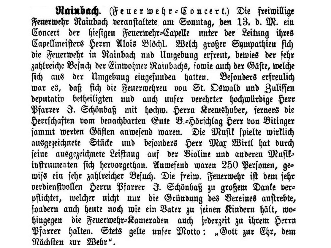 Rainbach. (Feuerwehr-Concert.) Die freiwillige Feuerwehr Rainbach veranstaltete am Sonntag, den 13, d. M. ein Concert der hiesigen Feuerwehr-Capelle unter der Leitung ihres Capellmeisters Herrn Alois Blöchl. Welch großer Sympathien sich die Feuerwehr in Rainbach und Umgebung erfreut, bewies der sehr zahlreiche Besuch der Einwohner Rainbachs, sowie auch der Gäste, welche sich aus der Umgebung eingefunden hatten. Besonders erfreulich war es, daß sich die Feuerwehren von St. Oswald und Zulissen deputativ betheiligten und auch unser verehrter hochwürdige Herr Pfarrer I. Schönbaß mit hochw. Herrn Kremshuber, ferners die Herrschaften vom benachbarten Gute B.-Hörschlag Herr von Bitinger sammt werten Gästen anwesend waren. Die Musik spielte wirklich ausgezeichnete Stücke und besonders Herr Max Wirtl hat durch seine ausgezeichnete Leistung auf der Violine und anderen Musikinstrumenten sich hervorgethan. Anwesend waren 250 Personen, gewiss ein sehr zahlreicher Besuch. Die freiw. Feuerwehr ist dem sehr verdienstvollen Herrn Pfarrer I. Schönbaß zu großem Danke verpflichtet, welcher nicht nur die Gründung des Vereines anstrebte, sondern auch heute noch wie ein Vater zu seinen Kindern hält, wohingegen die Feuerwehr-Kameraden auch jederzeit zu ihrem Herrn Pfarrer halten. Stets gelte unser Motto : „Gott zur Ehr, dem Nächsten zur Wehr“.