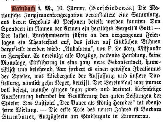 Der katholische Burschenverein führte an den vergangenen Feiertagen ein Theaterstück auf, das selten auf ländlichen Bühnen dargestellt werden wird: „Andaluma“, von P. Le Roy, Missionär in Zanzibar. Es vereinigt alle Vorzüge, packende Handlung, keine Monologe, Einführung in eine ganz neue Gedankenwelt, humoristisch und belehrend. Nur fordert es einen gewissen Idealismus der Spieler, was Wiedergabe der Auffassung und äußere Darstellung, nämlich zehn Neger, betrifft. Der Vereinssaal war immer voll besetzt, manche gingen sogar zwei- und dreimal. Aufrichtige Anerkennung bekundet die Bevölkerung den guten Leistungen der Spieler. Das Lustspiel „Der Bauer als König Herodes“ tat ebenso