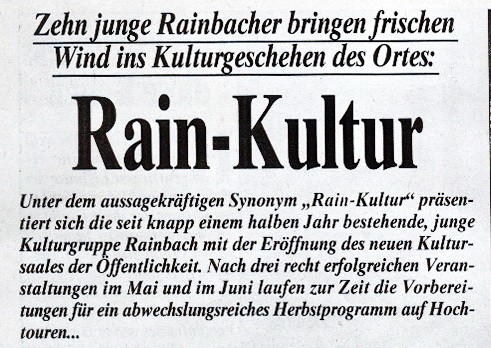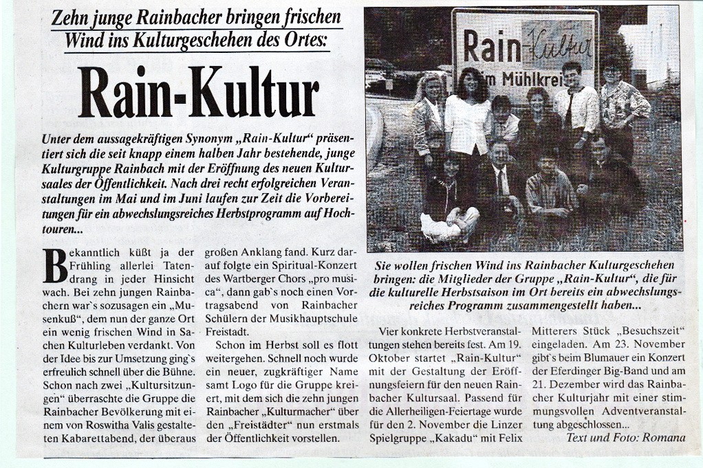 Über die vielen Veranstaltungen, die auf Initiative dieser von 1991 bis 2001 aktiven Kulturgruppe in Rainbach stattfanden, kann man im Online-Archiv der Gemeinde unter "64-1 Vereine 1 A-R Rainkultur 1 1991-1996 und 64-2 Vereine 1 A-R Rainkultur 2 1997-2001" nachlesen.