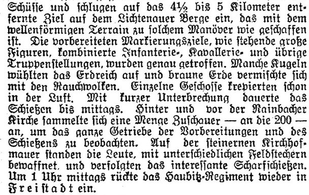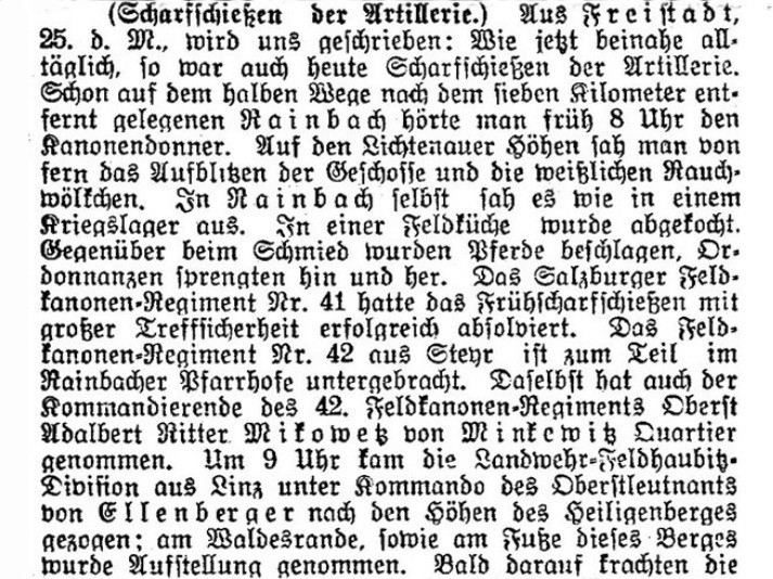 (Scharfschießen der Artillerie.) Aus Freistadt, 3. d. M., wird uns geschrieben: Wie jetzt beinahe alltäglich, so war auch heute Scharfschießen der Artillerie. Schon auf dem halben Wege nach dem sieben Kilometer entfernt gelegenen Rainbach hörte man früh 8 Uhr den Kanonendonner. Auf den Lichtenauer Höhen sah man von fern das Aufblinken der Geschosse und die weißlichen Rauchwölkchen. In Rainbach sah es wie in einem Kriegslager aus. In einer Feldküche wurde abgekocht. Gegenüber beim Schmied wurden Pferde beschlagen, Ordonnanzen sprengten hin und her. Das Salzburger Feldkanonen-Regiment Nr. 41 hatte das Frühscharfschießen mit großer Treffsicherheit erfolgreich absolviert. Das Feldkanonen-Regiment Nr. 42 aus Steyr ist zum Teil im Rainbacher Pfarrhofe untergebracht. Daselbst hat auch der Kommandierende des 42. Feldkanonen-Regiments Oberst Adalbert Ritter. Mikowetz von Minkewitz Quartier genommen, Um 9 Uhr kam die Landwehr-Feldhaubitz-Division aus Linz unter Kommando des Oberſtleutnants von Ellenberger nah den Höhen des Heiligenberges gezogen; am Waldesrande, sowie am Fuße dieses Berges wurde Aufstellung genommen. Bald darauf krachten die Schüsse und schlugen auf das 4 1/2 bis 5 Kilometer entfernte Ziel auf dem Lichtenauer Berge ein, das mit dem wellenförmigen Terrain zu solchem Manöver wie geschaffen ist. Die vorbereiteten Markierungsziele, wie stehende große Figuren, kombinierte Infanterie-, Kavallerie- und übrige Truppenstellungen, wurden genau getroffen. Manche Kugeln wühlten das Erdreich auf und braune Erde vermischte sich mit den Rauchwolken. Einzelne Geschosse krepierten schon in der Luft. Mit kurzer Unterbrechung dauerte das Schießen bis mittags. Hinter und vor der Rainbacher Kirche sammelte sich eine Menge Zuschauer -- an die 200 - an, um das ganze Getriebe der Vorbereitungen und des Schießens zu beobachten. Auf der steinernen Kirchhofmauer standen die Leute, mit unterschiedlichen Feldstechern bewaffnet und verfolgten das interessante Scharfschießen. Um 1 Uhr mittags rückte das Haubitz-Regiment wieder in Freistadt ein.