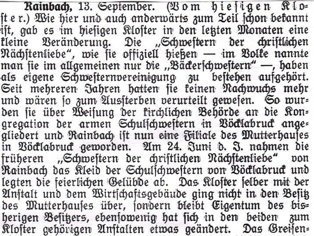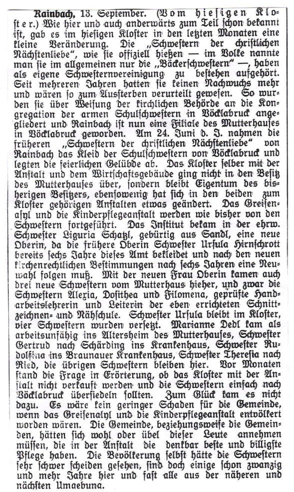 Rainbach, 13. September. (Vom hiesigen Kloster.) Wie hier und auch anderwärts zum Teil schon bekannt ist, gab es im hiesigen Kloster in den letzten Monaten eine kleine Veränderung. Die „Schwestern der christlichen Nächstenliebe“, wie sie offiziell hießen – im Volke nannte man sie im allgemeinen nur die „Bäckerschwestern“ -, haben als eigene Schwestervereinigung zu bestehen aufgehört. Seit mehreren Jahren hatten sie keinen Nachwuchs mehr und wären so zum Aussterben verurteilt gewesen. So wurden sie über Weisung der kirchlichen Behörde an die Kongregation der armen Schulschwestern in Vöcklabruck angegliedert und Rainbach ist nun eine Filiale des Mutterhauses in Vöcklabruck geworden. Am 24. Juni des Jahres nahmen die früheren „Schwestern der christlichen Nächstenliebe“ von Rainbach das Kleid der Schulschwestern von Vöcklabruck und legten die feierlichen Gelübde ab. Das Kloster selber mit der Anstalt und dem Wirtschaftsgebäude ging nicht in den Besitz des Mutterhauses über, sondern bleibt im eigentum des bisherigen Besitzers, ebensowenig hat sich in den beiden zum Kloster gehörigen Anstalten etwas geändert. Das Greisenasyl und die Kinderpflegeanstalt werden wie bisher von den Schwestern fortgeführt. Das Institut bekam in der ehrwürdigen Schwester Liguria Schatzl, gebürtig aus Sandl, eine neue Oberin, da die frühere Oberin Schwester Ursula Hirnschrott bereits sechs Jahre dieses Amt bekleidet und nach den neuen kirchenrechtlichen Bestimmungen nach sechs Jahren eine Neuwahl folgen mjuss. Mit der neuen Frau Oberin kamen auch drei neue Schwestern vom Mutterhaus hieher, und zwar die Schwestern Alexia, Dosithea und Filomena, geprüfte Handarbeitslehrerin und Leiterin der eben errichteten Schnittzeichnen- und Nähschule. Marianne Dedl kam als arbeitsunfähig in Altersheim des Mutterhauses, Schwester Gertrud nach Schärding ins Krankenhaus, Schwester Rudolfina ins Braunauer Krankenhaus, Schwester Theresia nach Ried, die übrigen Schwestern blieben hier. Vor Monaten stand die Frage in Erörterung, ob das Kloster mit der Anstalt nicht verkauft werden und die Schwestern einfach nach Vöcklabruck übersiedeln sollten. Zum Glück kam es nicht dazu. Es wäre kein geringer Schaden für die Gemeinde, wenn das Greisenasyl und die Kinderpflegeanstalt entvölkert worden wäre. Die Gemeinde, beziehungsweise die Gemeinden, hätten sich wohl oder übel dieser Leute annehmen müssen, die in der Anstalt die denkbar beste und billigste Pflege haben. Die Bevölkerung selbst hätte die Schwestern sehr schwer scheiden gesehen, sind doch einige schon zwanzig und mehr Jahre hier und fast alle aus der näheren und nächsten Umgebung.