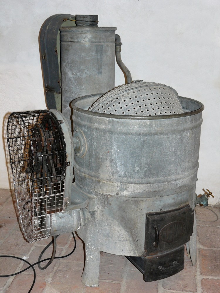Das Gerät links vorne ist eine Trommelwaschmaschine. Unsere heutigen modernen Waschmaschinen funktionieren nach dem gleichen Prinzip. Durch eine Ausbuchtung in der Trommel wird die Wäsche bei bewegter Trommel mit nach oben genommen. Dann fällt die Wäsche nach unten und wird dadurch zusammengedrückt. Somit wird mit dem Wasser der Schmutz aus den Wäschestücken gedrückt. Dieser vielfach wiederholte Vorgang sorgt dafür, dass die Wäsche sauber wird.