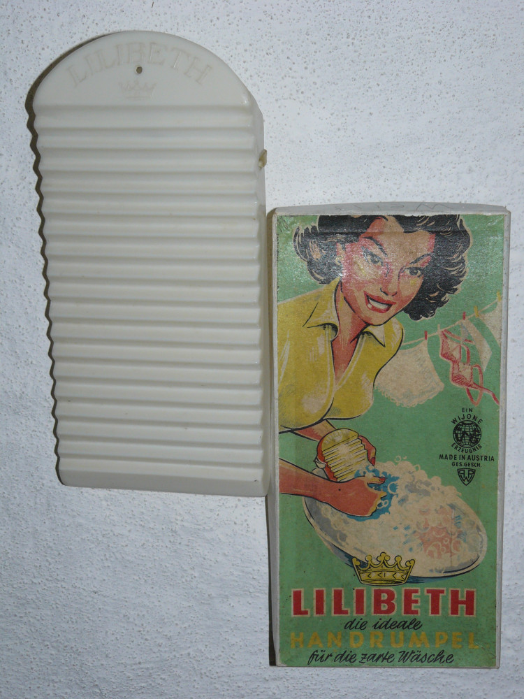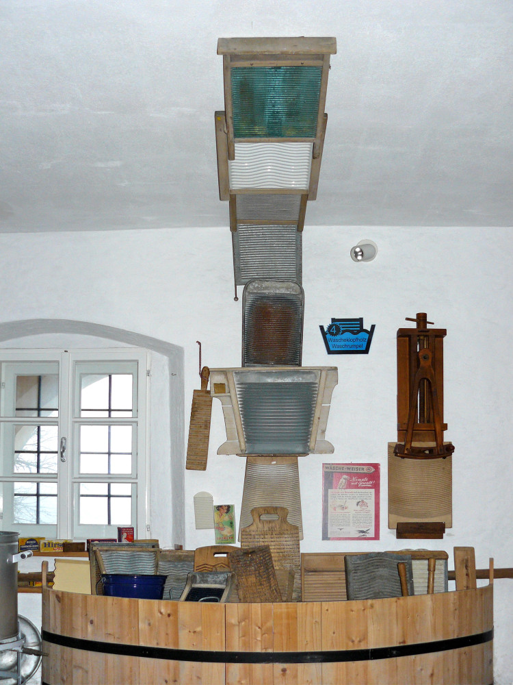 Das Schlagen mit dem Wäscheklopfholz (zu sehen in der Fensternische) oder das Reiben auf dem Waschbrett waren früher gebräuchliche Methoden, um die Wäsche sauber zu bekommen. Die Waschbretter wurden nicht nur aus Holz gefertigt, sondern aus verschiedensten Materialien. Die Sammlung zeigte die verschiedensten Arten und einen speziellen Hobel, mit dem man die Waschrumpeln anfertigte.