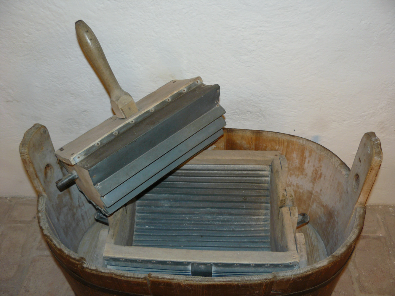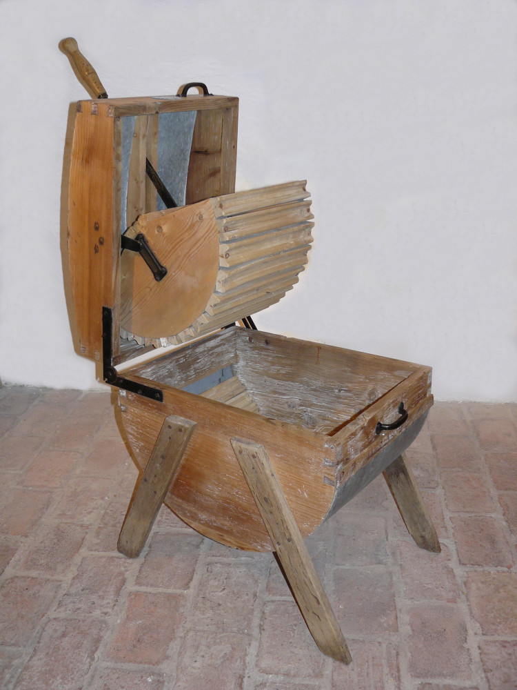 Die ersten Geräte hatten Rillen am Boden des Behälters und am bewegten Teil wie ein Waschbrett und wurden händisch betätigt.