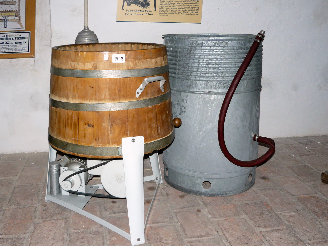 Die Geräte am untersten Foto sind elektrisch betriebene Waschglockenmaschinen mit Rillen am Behälterrand.