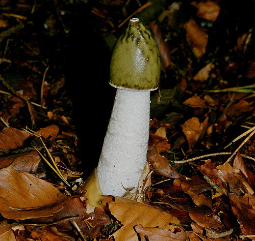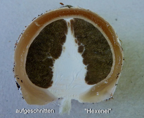 Zur Stink-Morchel: Aus einer etwa 5 cm hohen Knolle, dem „Hexenei“ wächst ein bis 20 cm hoher, weißer Stiel, der eine oliv- bis schwarzgrüne, mützenartige Kappe trägt. Die „Gleba“ (= die Sporenschicht) der Kappe strömt einen süßlichen Aasgeruch aus, der Fliegen und Aaskäfer anlockt. Sie „bekleckern“ sich mit Pilzsporen und sorgen so für die Verbreitung des Pilzes.